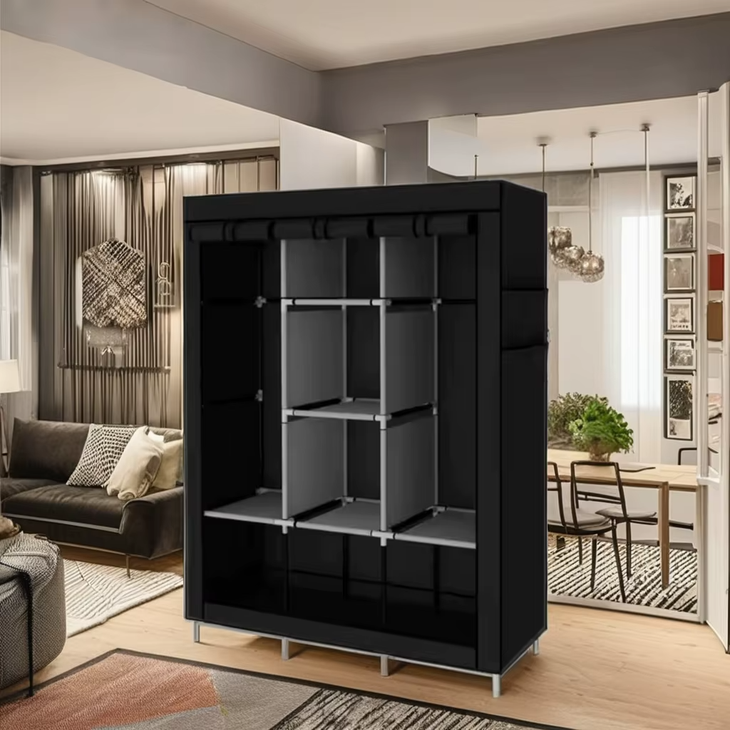 Fabricado en tela no tejida (non-woven) antipolvo y un marco de acero reforzado, este armario mantiene tu ropa ordenada, protegida y lista para usar. Incluye barra para colgar, repisas amplias y cubierta frontal enrollable para máxima practicidad.