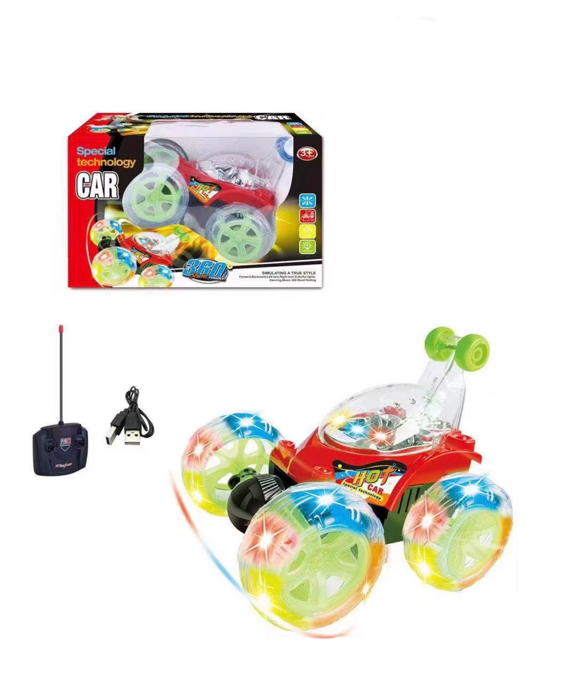 El Stunt RC 360° combina potencia, luces LED y giros extremos para una experiencia FULL adrenalina. Puede rotar, voltear, pararse sobre sus ruedas gigantes y correr en cualquier superficie. ¡Un juguete que nunca se queda quieto!